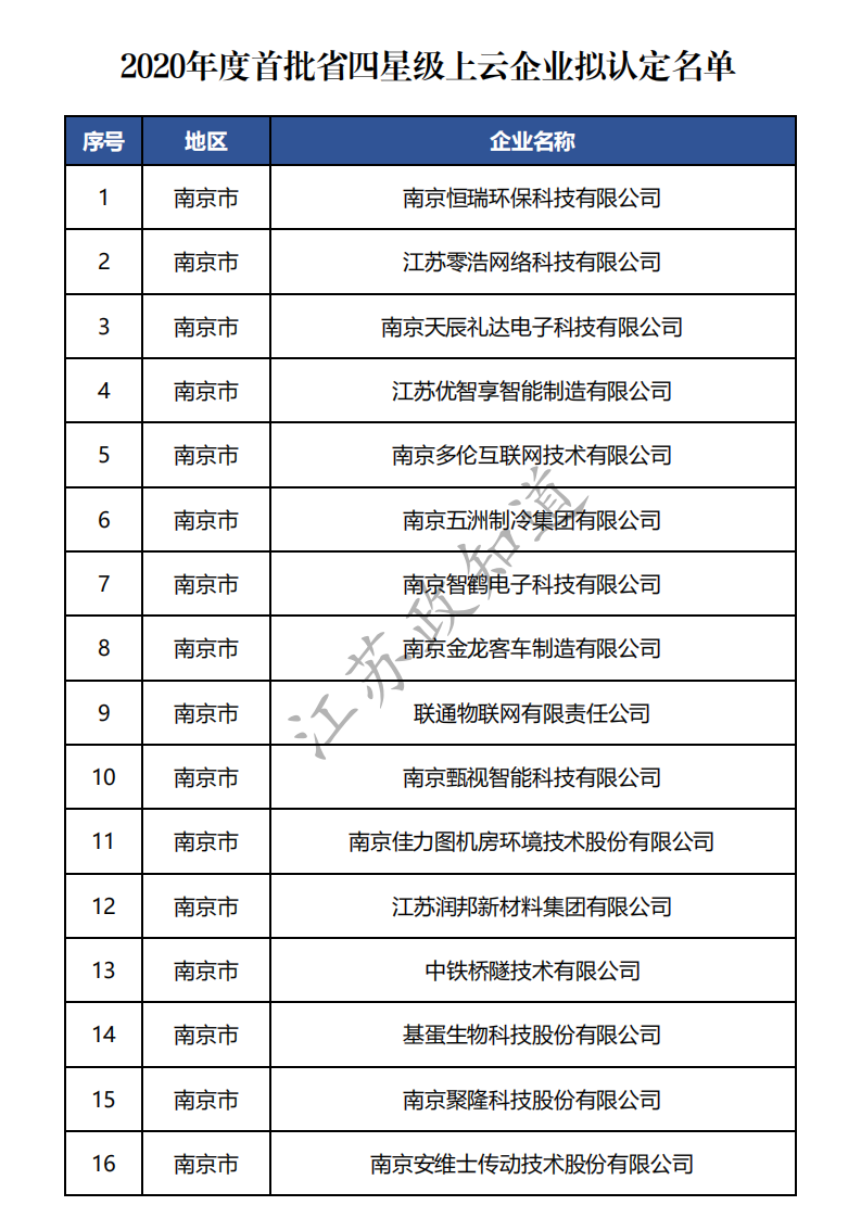为贯彻落实《省政府关于深化“互联网+先进制造业”发展工业互联网的实施意见》(苏政发〔2018〕98号),以及《江苏省星级上云企业评定工作指南(2020年版)》(苏工信融合〔2020〕85号)文件精神,大力推进企业上云三年行动计划,前期我们组织开展了2020年度首批省星级上云企业评级工作。经企业申报、各地审核推荐、专家评审、信用审查、专题会审等程序,拟将国网江苏综合能源服务有限公司等51 家企业、南京恒瑞环保科技有限公司等 408 家企业、南京上古网络科技有限公司等 1541 家企业分别认定为2020年度首批省五星级、四星级上云企业,现予以公示。